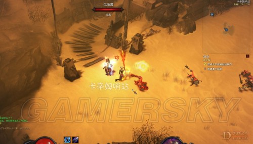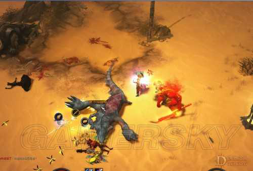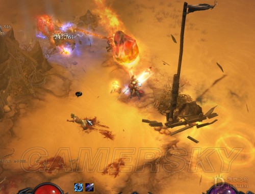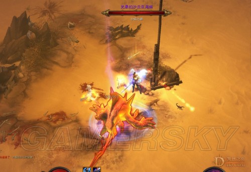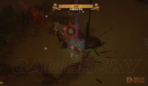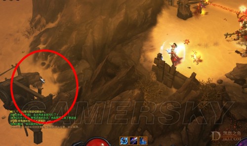 2、选择继续任务,从传送门进来后,向右探路,法师一个连闪应该就行了,寻找随机刷新的下图所示的这样一个地形。这里会随机刷新一个事件一个垂死挣扎的npc被沙蜥吞食,然后可爱的紫名沙蜥就会跳出来了,干掉拿精华走人。
