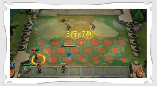 《云顶之弈》的棋盘是3行x7列的,为了更方便的讨论,我们提前给每一个格子具体命名,规则如下:左上为123、左中为456、左下为789、右上为QWER、右中为ASDF、右下为ZXCV。