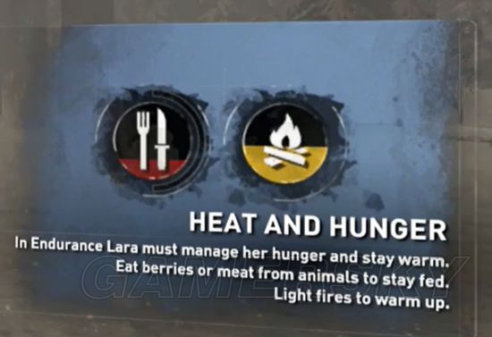 劳拉在奔跑、攀爬、战斗时会消耗体力,而维持体力必须不断进食,所以玩家需要主动捕猎野生动物或者采摘野果来充饥;而在西伯利亚的冰天雪地里最近在咫尺的死亡显然来自于低温,玩家必须在劳拉体温降至致死线之前寻找靠谱的地点生火。体温会在出于室内和洞穴时停止下降,但想要恢复提问则必须依赖篝火。