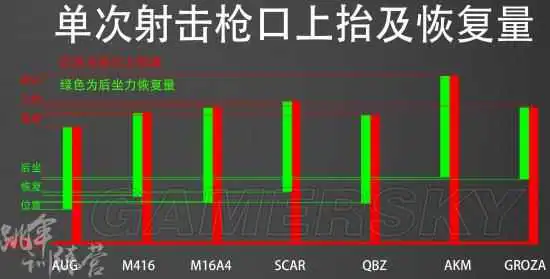 除开泼水扫射外,面对远距离的敌人更需要单发点射,但除开子弹速度外单发后坐力与恢复量也是保证稳定性不可或缺的因素。从图中可以看出,在单发后坐力恢复量上,AUG与M16有着绝对的优势,AKM、SCAR、Groza在这点上几乎可以放弃了。