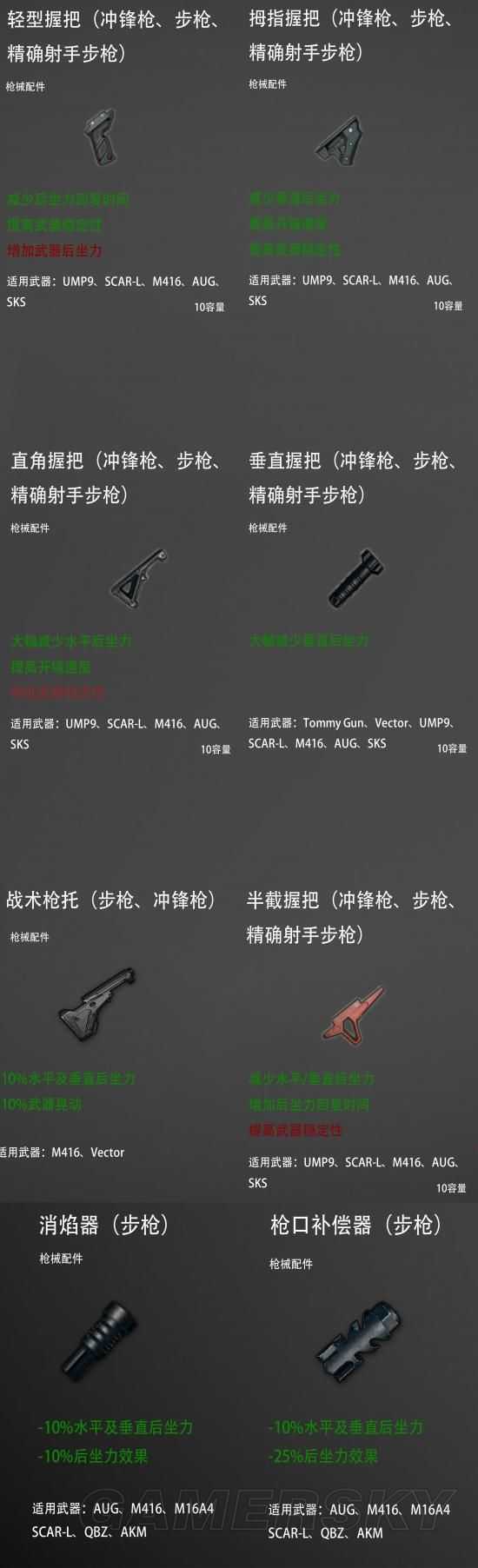 在配件上小编将步枪可以装配的配件悉数列举了出来,一图足以了解所有配件特性。