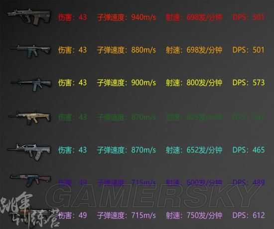 在这张图中就可以将各种数据量化显示出来,从图中可以看出在5.56步枪中AUG拥有着绝对的优势。在射速上与M416完全持平,但在子弹速度上确是步枪中最快的,甚至超过了部分的狙击枪与精确射手步枪,在远距离射击上有着绝对的优势。其他方面几款5.56mm步枪几乎持平。
