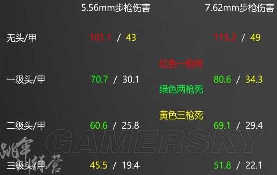 在步枪中伤害只有43与49两个数值,经过不同部位的伤害计算统计出上面的图片。从上图中可以看出在没有头盔情况下所有步枪都可以做到一发入魂。另外在面对一级甲时7.62武器可以做到三枪带走而5.56需要四枪,一枪的差距足以改变战局。