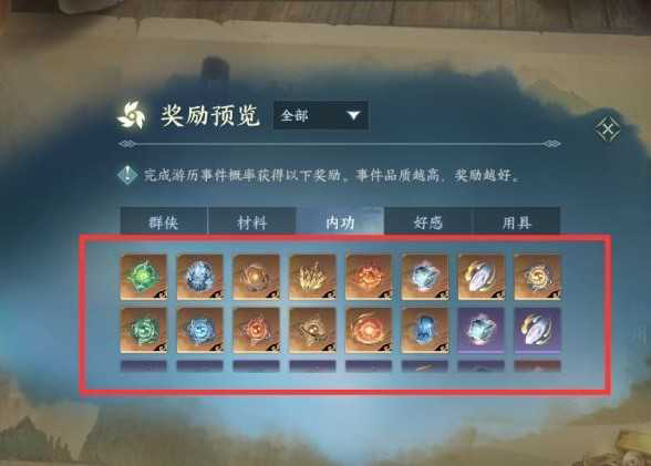 完成游历时间有概率获得金色内功心法,建议行囊食物都放绝品,有游历道具都装上!