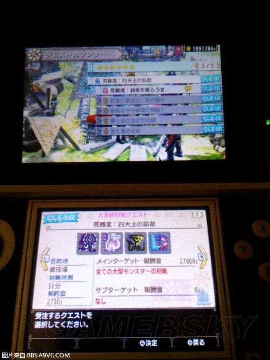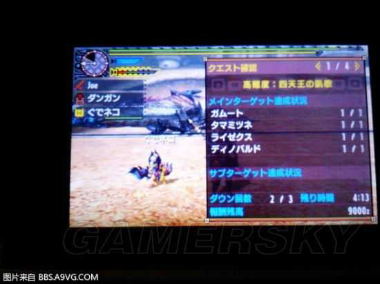 其实也没有打算第一次打就能打过(因为我的装备不是太好,斩龙套装升了一级防御371,武器是鬼神斩破刀 真打=215攻,23雷)。开始只是想去看看怪物的实力(然而受到怪物的攻击,还是很痛啊!结果还是猫了两次!!)和任务的形式。开局一看,呆了!怪物是2vs1猎人,打死一只怪物,1分钟之后第三只怪就会出来。换句话说,在死去的怪物消失前的1分钟里,你有1分钟的时间和另外的怪物独处!多利用场内措施,尤其是铁栏,尽可能把两只怪物分开对付。道具多带回复系,闪光不怎么需要,多带陷阱比较好。总之保命要紧,打游击战就是了,时间是比较充裕的,不过还是要看临场发挥了......最后一句:怪物的攻击需要比较高,不过血量很低!