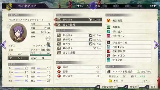 初期就有神技合围箭,可以定住危险目标让我方能更安全的处理的敌人,后骑高移动+穿越+3-7射程的狙击,配上个人技能的异能生存体(?)弓达人那些,火力也有保证,负责和库罗德一起清对面后排,那个8移动配合3-7狙击我还以为是我在玩机战哩,妳的本名是贝尔纳迪塔.丘比?