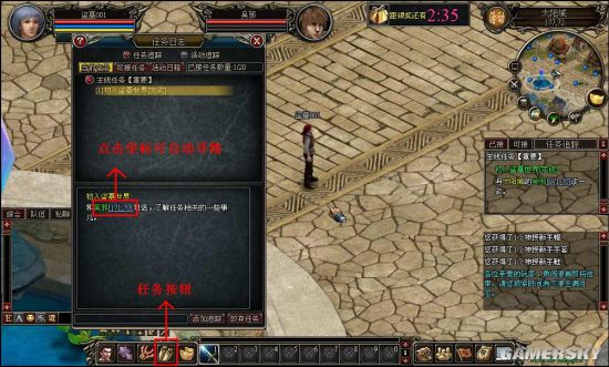 任务按钮可看到当前所接的任务列表,人物名称可看到任务详情,NPC名字后的坐标可实现自动寻路。