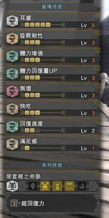 爆鳞头加尸套三件套加丝瓜腿,其他插插珠子,护石耳塞,武器带一孔,没孔就不要满足感,200血配合不被晕加快吃加回复量up,再加上尸套三件套回血,包你死不了,顺便珠子还都是些r6的,非常适合新手。