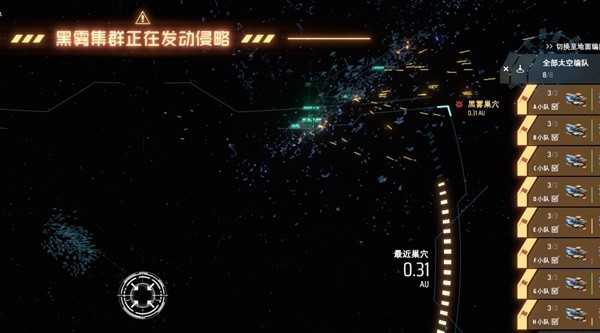 注意太空黑雾巢穴基本是0速度,所以接近时不要太快。在距离巢穴0.6 Au的时候摁s速度降到最低,等待能量回满部署舰队。然后缓慢靠近巢穴到0.5 Au。再次停下来,摁z进入战斗模式。然后是重点,摁ctrl或者右上角舰队栏位有个指挥选项,选中后会以伊卡洛斯为中心建立一个平面,垂直于腰部~脑袋的线(拦腰截断)。你可以在这个平面上指挥舰队,但因为视角问题非常难调。遥控舰队到0.5 Au开外的黑雾巢穴(注意显示的距离一定要对的上,视角问题不能目测),然后自己督战即可。注意期间不要靠近,否则会被秒。