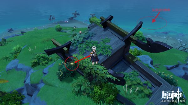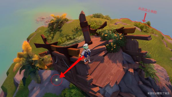 爬上/飞上山顶后,就会看到半截船,需要绕到船的后面才能找到“有些残破的木板”,然后拾取它就算找完第一处的半截船啦。