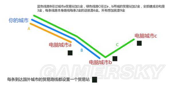 这是比较理想的贸易线布局,如果地形因素导致贸易线不重叠经过就不会产生如此的加成,但是如果精心布局自己的贸易线 如果多条比如10条贸易线产生的价值还是非常可观的。