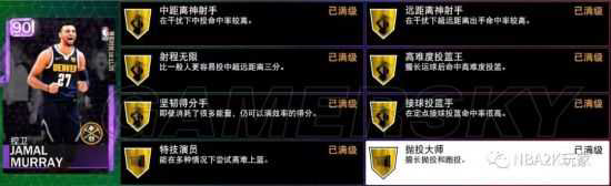 这张穆雷紫水晶卡属性六大项中有一项高光(外线得分)、一项绿区(运动能力)、一项黄区(组织能力)和三项红区(内线得分、防守能力、篮板能力)。