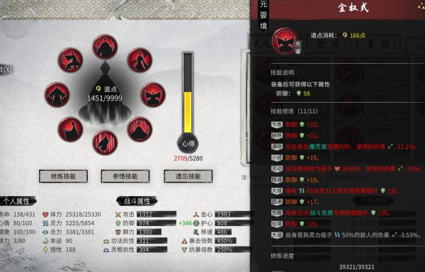 带防御功法和不带防御功法的面板,带上以后加了346,大家可以用功法资质总和去计算下战斗资质加成的防御能不能对得上这个346的加成。