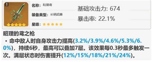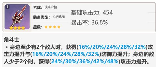 拥有四星长枪角色的最高倍率,一级普攻总倍率322%略低于五星胡桃。在队伍没有五星主c的情况下当四星主c也是不错的选择。