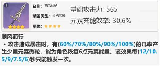 武器推荐:西风长枪:高充能加被动充电宝更快充满爆发能量。