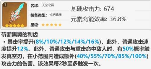 天空之脊:元素充能可以更快充满爆发,被动的暴击加成以及12%的攻速加成大幅提升(bushi)普通攻击的伤害,加上额外40%攻击力的范围伤害…要是实在没五星就用它吧…毕竟白板数值摆在这里。