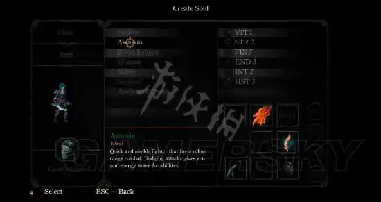 武器为匕首,高敏捷,攻击速度快,连段高,攻击消耗耐力较少,攻击后摇小。