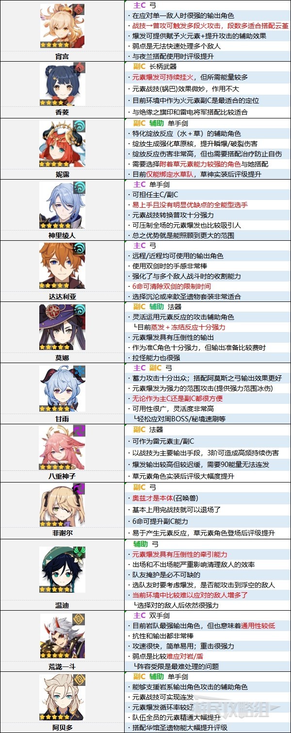 ※风元素角色的评价由于圣遗物【翠绿之影】四件套的减益效果多数都会上榜,其中具有特殊减益能力的角色评级较高。