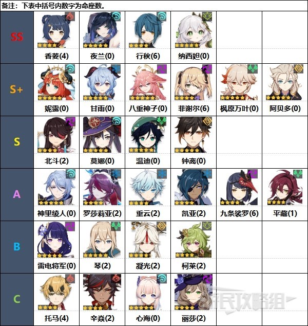 ※下方角色名后括号内数字为命座数,角色排名可能会受其他因素影响。