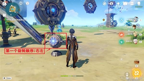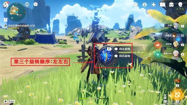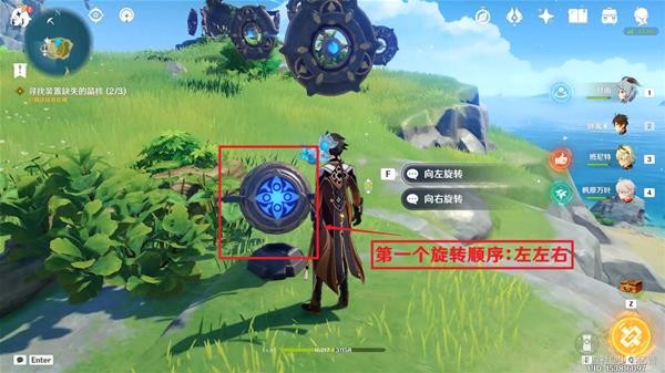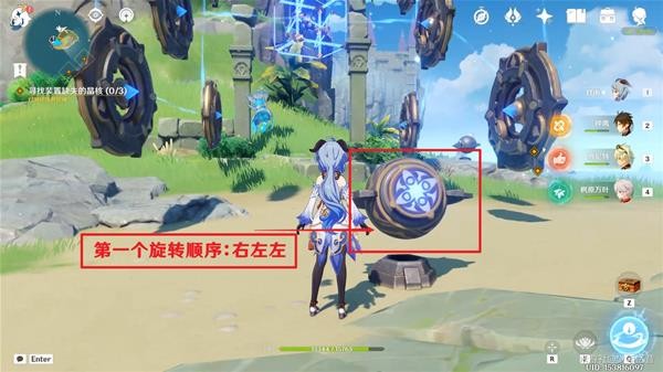 首先来到①号位置,第一个是面前这个机关,我们按照“右左左”的顺序旋转,旋转正确后,机关会落下且无法操作哦,后面几个同理