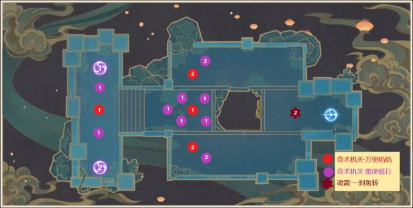 第一波怪来之前先摆好所有标1的机关,通关后,在第二波怪来之前摆好所有标2的机关即可。