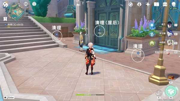 切换水元素角色(芭芭拉),前往3个清理位置攻击