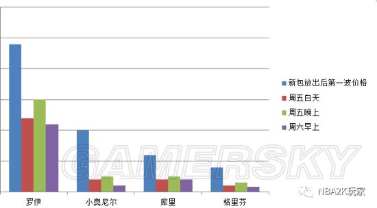 小编之前曾发邮件给2K,希望能获取拍卖行球员卡价格的信息,但2K答复告知这部分数据不能对外开放,于是小编昨天安排了几名朋友,在不同的时间段留意了一下PC和主机端新球员卡的拍卖行价格,汇总成了下面的图表以供大家参考。