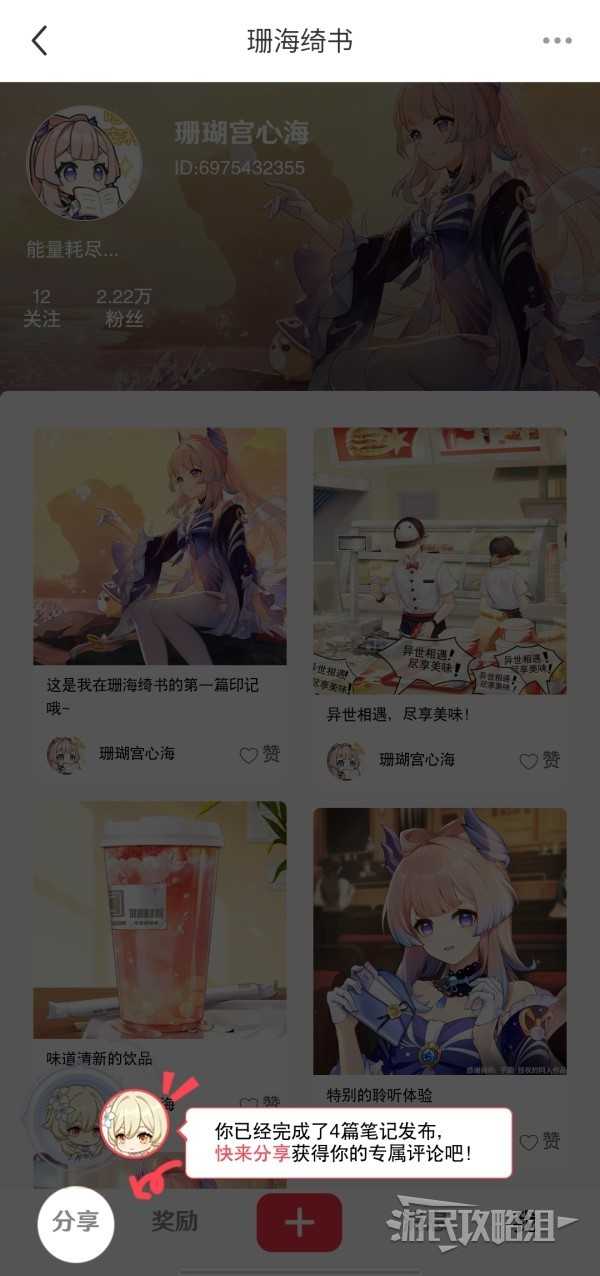 然后按照提示完成所有步骤,即可一共需要帮助珊瑚宫心海发布4篇笔记,每写完一篇笔记并发布后,屏幕上方的返回按键即可返回上一页,然后左下角闪动的主角头像即可继续写下一篇笔记。