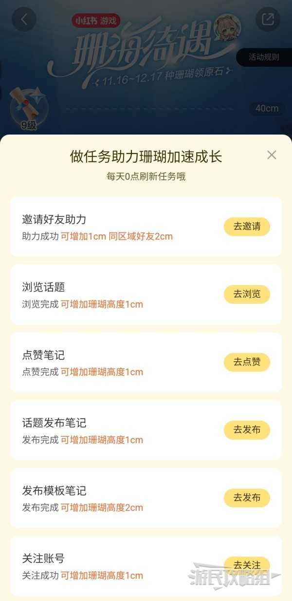 下方的【加速生长】,打开任务列表,完成任务即可让加速珊瑚生长。任务都很简单,直接点后方黄色按钮即可。这些任务每天都会在0点刷新,在活动结束前记得及时领取并兑换奖励。