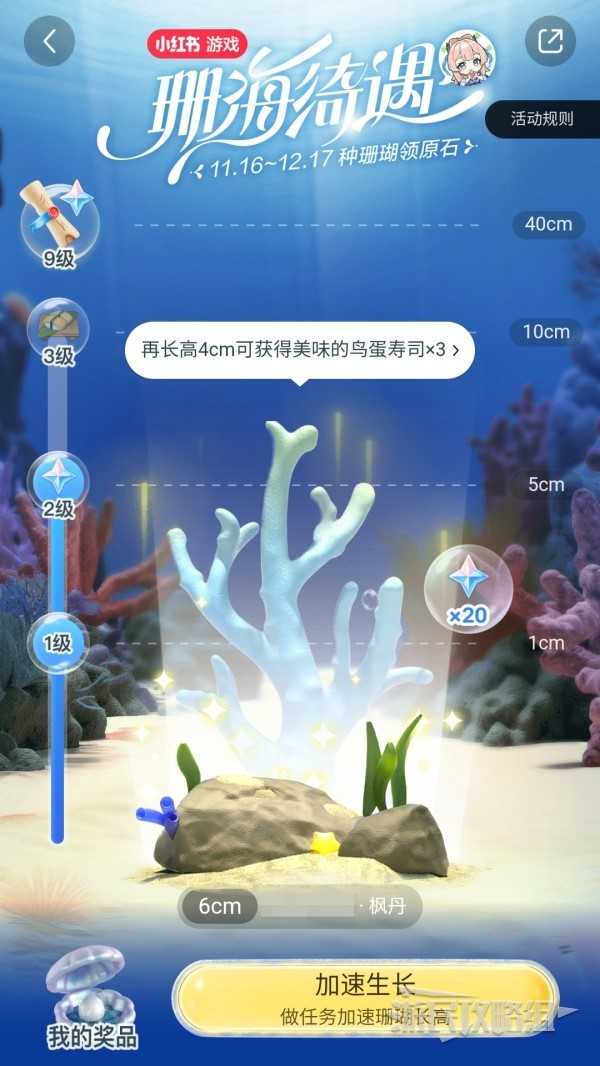 开始种珊瑚后,珊瑚长高到一定程度可以升级,每级都可以解锁对应奖励。已经获得的奖励可以在左下角【我的奖品】中查看。