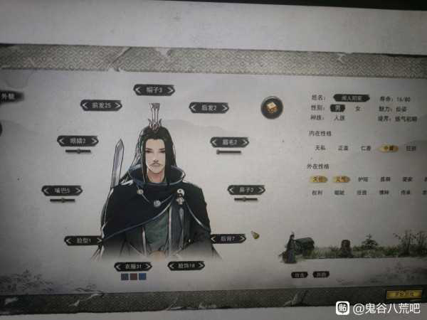 《鬼谷八荒》玩家们能够通过捏脸系统让自己的角色更有魅力,更高的魅力将会对之后NPC的态度有些影响,下面请看玩家“呵呵你别笑哈哈”分享的《鬼谷八荒》男角色高魅力值捏脸参数,希望能为各位玩家带来一些帮助。