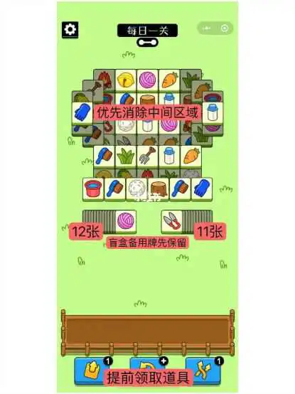 3.配合使用道具和备用牌消除中间区域最底层的牌
