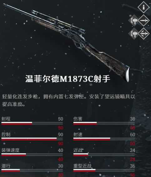 不推荐用这个。除非你想适应一下瞄准镜,用它练手。不过1873系列70m的致死距离就决定了这把枪即使有瞄准镜也不适合远程作战。如果非要用,点出开镜枪手和稳定瞄准。这两个技能对大多数狙击枪的手感而言都会有一个质的提升。