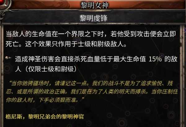 斩杀效果,分支小点可以斩杀将级首领,讲白了,这个技能就是为你节省15%的时间,帮助你提升打怪效率,配合者法术,可以迅速清怪。有人会问,你下面那个点为什么不点?请详细看技能说明,下面那个是提升神圣攻击,并不是增加你的攻击,自己去品。