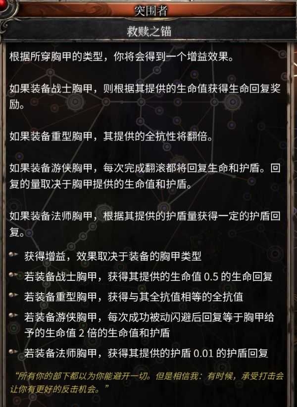 最核心的输出技能,触发中毒,流血特效,清小怪时点出AOE范围,打BOSS 改为增加伤害。天赋我点了吸血,舍弃吸血突围者里还可以点出20%的爆伤出来