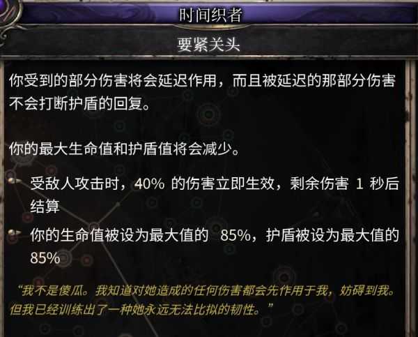 技能详细明了,增加生存能力,配合自己的战甲,更难死了,本来要被秒,现在可以快乐的吸吸吸,当然也是为了点出对敌施加异常层数的上限。有人又问了,哎呀,你右面的那个停滞伤害怎么不点,因为我的停滞伤害只有以太穿越,以太穿越延迟后再生效有何意义?不靠他输出。过路点出怪多伤害增加,怒气高伤害增加,点数充足的情况加可以点出全局吸血。