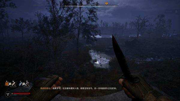 接下来可以顺着废弃村庄一直向前走,可以看到一个碉堡,赫尔曼叫我们进去找涅戈达博士。下图白色圈圈处就是入口的位置,正中间的医疗箱,可以用枪械或者小刀打开,里面有绷带或者医疗包。