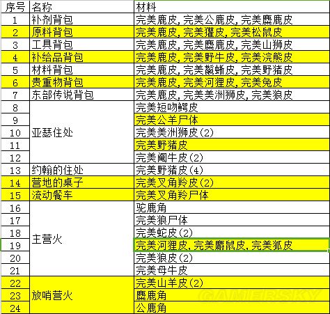 营地捐了之后就会存在里面,在制造的时候就从这里面拿材料,但是比较坑的是材料会溢出,比如我捐了4张完美狐皮才知道其实一共就需要1张。。所以到底捐多少还是看了下面的表格再决定吧。。