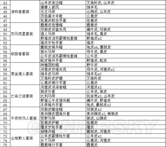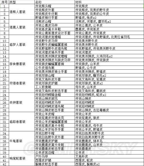 捕猎人制造服装应该是这游戏最大的坑了,一共有116件不重复的服装,其中16套套装,套装部位也可以单独制造。需要海量的3星完美动物皮和传说动物皮以及鸟类羽毛。营地升级完了之后所有的狩猎材料基本都卖给捕猎人了,幸好这货附近有火车站,要过去比营地方便多了。。