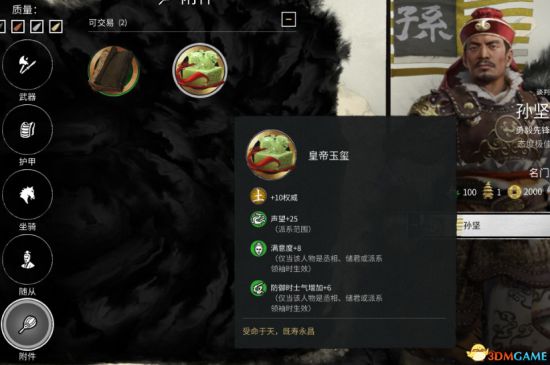这传国玉玺有四条属性,声望我们已在之前提过了,还有两条特别的属性这里必须要讲明白。当一个道具装备(或技能)拥有(仅当该人物是丞相、储君或派系领袖时生效)这一词条时,只要装备在符合要求的人物身上就能发挥效用,且该效用将泽被全派系。