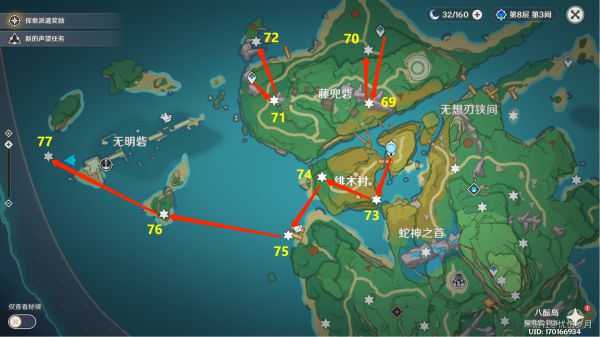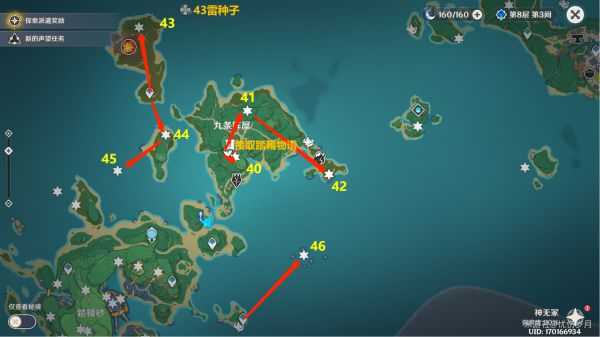 34 河中心,3个仙灵台(元素视野,有一个在结界里拿完雷种子用留念镜照小狐狸),激活雷种子后飞