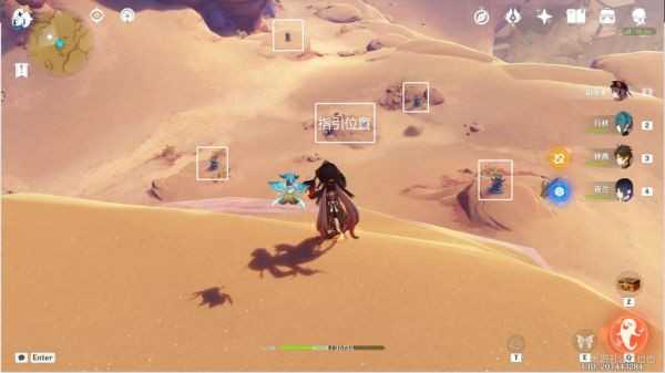 使用风系角色,吹散松散的沙堆,激活图中指引的4处火元素方碑,获得宝箱六