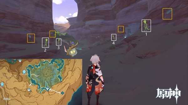 传送浮罗囿南方向锚点,往地图的东南方向山洞走,按图中数字顺序激活4个草元素方碑(岩石上图案点的数量为激活顺序)