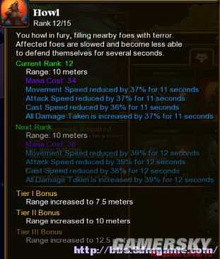 狼嚎:提高输出和增加防御的技能,不过在战旗出来之前不建议加太高级别,否则回蓝吃紧,在战旗和wolfpack加出后能加点了就加,最后12.5米的范围异常恐怖,加满后敌人移动、攻击和施法速度均减半,持续时间也有12秒以上。与这个技能作比较的是冰霜吐息,这个技能初期近身肉搏时比狼嚎有优势,冰冻、减速、提高伤害都比狼嚎好,而且肉搏范围随便喷一下都能喷中敌人,但到了后期狼嚎属性逐渐赶上,在此build成型后狼嚎非常实用,冰霜吐息就不太好用了,一是持续时间短,仅仅4秒,等走好位准备输出了时间也差不多到了,二是范围较小、有角度限制,对操作要求更高,三是又多了一个主动技,操作繁琐。为了方便比较和测试,用控制台修改了技能点,从下面2个图可以看出狼嚎更适合远程输出用