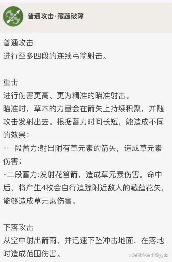 提纳里普通攻击的核心是二段蓄力机制。二段蓄力会发射花筥箭,并且可以产生4枚具备追踪效果的藏蕴花矢。藏蕴花矢的总伤害比花筥箭高,因此实战一般依靠二段蓄力打出伤害。但是提纳里二段蓄力时间过长,无法和甘雨的二段蓄力相比,这也决定了低命提纳里做一个副c更合适。