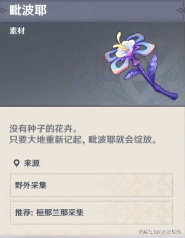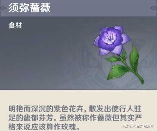须弥蔷薇是一种明艳而深沉的紫色花卉,散发出使人驻足的馥郁芬芳,其作用是一种食材,可以制作许多须弥料理。