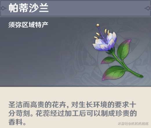 帕蒂沙兰是圣洁而高贵的花卉,作为须弥地区特产,之后可能会作为角色的突破材料,目前也可以作为食材制作须弥料理。