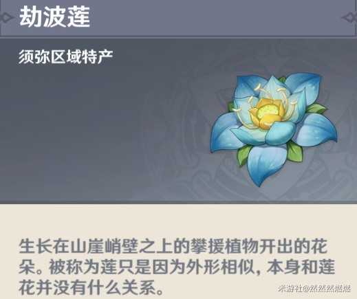 劫波莲生长在山崖峭壁之上,因外表与莲相似,故称为莲。其作为须弥地区特产,是角色的突破材料,可用于多莉的突破,主要分布于桓那兰那和须弥城附近,要给多莉突破要提前准备一些。