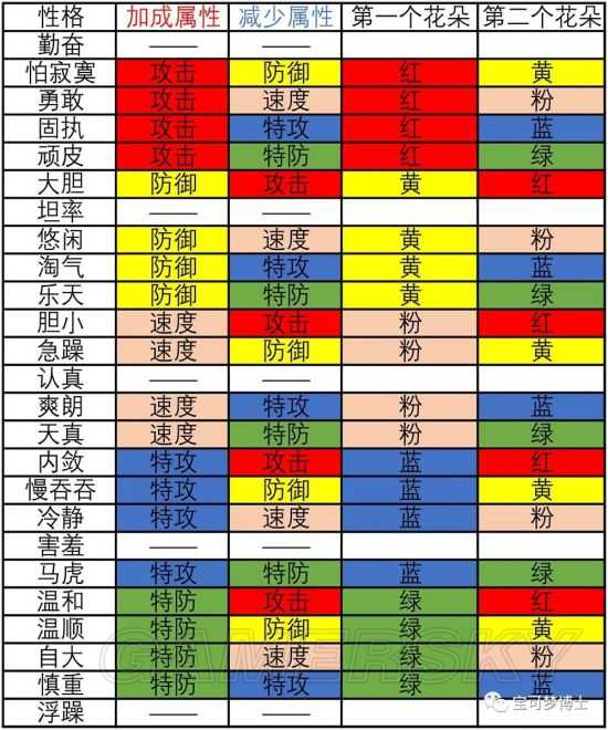 红色的特攻表示由性格的影响特攻加成1.1倍,而蓝色的特防则是特防加成0.9倍,意思特防不是增加而是减少。没有颜色则是无加成与减少,一个性格既然存在着加成,也同时存在着减少,当然不会有性格存在两个加成或是减少的。