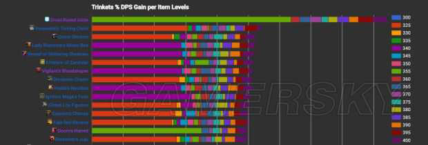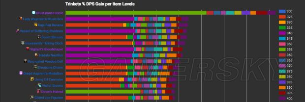 在340装等下,工程头特质领军T1梯队,提升DPS5.61%。同时飞驰流星虽T1垫底仍然表现亮眼,提升DPS4.06%。艾泽拉斯的勇士(3.8%)与枯败灌注(3.77%)在T2梯队表现突出,其余特质相互之间差距不大。